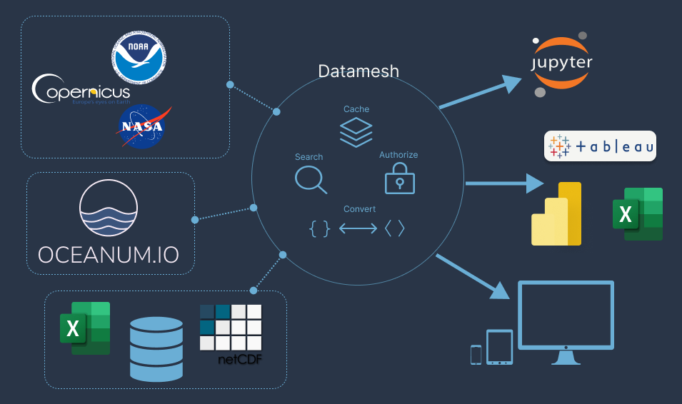 The Oceanum.io Datamesh is not like a standard data warehouse, data lake, database or GIS server and has two key differences to many existing data platforms: