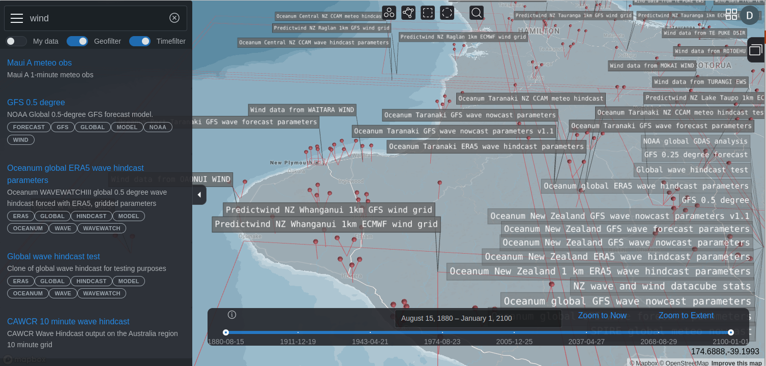 The Oceanum.io Datamesh is an cloud service for interacting with environmental data. It facilitates the discovery, management, and utilisation of all types of environmental datasets. You can access existing data in our extensive catalog or connect your own data. The Datamesh provides core functionality to facilitate the building of environmental data science workflows, pipelines and end-user applications.